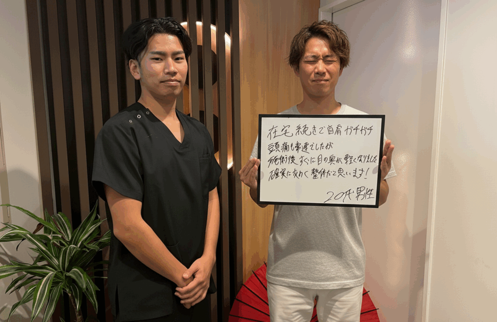 また、環境の工夫としてモニターの高さを調整することや、肘を机にしっかり預けて肩の余計な緊張を減らすこと、さらに「4秒吸って6秒吐く」という呼吸リズムを日常に取り入れていただいていることは非常に効果的です。整体の効果は施術だけで完結するのではなく、こうした小さな生活習慣の改善と組み合わせることで、より長期的に安定していきます。Y.Y様が積極的に実践されているからこそ、症状の改善がスムーズに進んでいるのだと感じます。