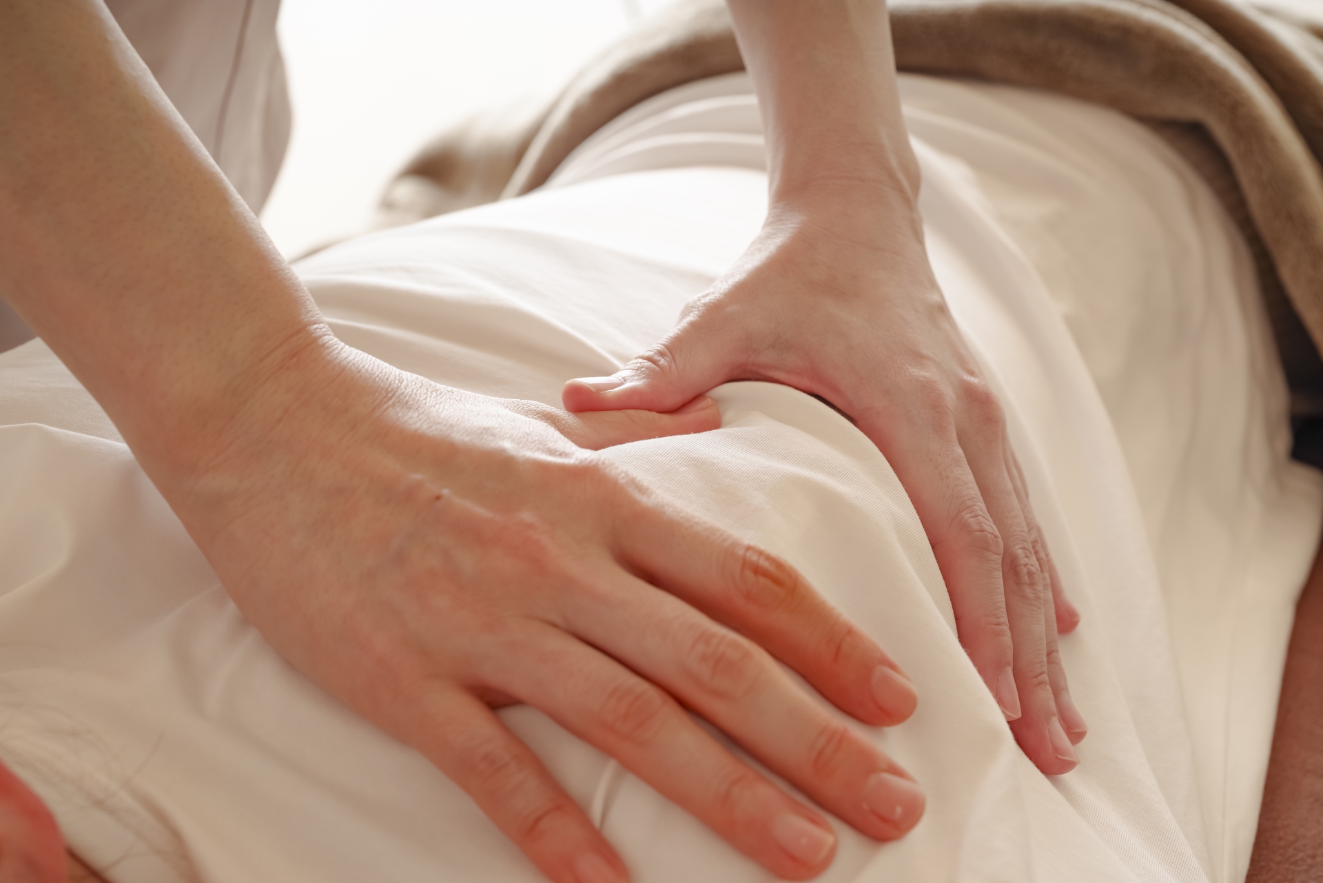 - 胸椎の伸展:受け手に深呼吸をしてもらい、吐く瞬間に肩甲骨の内側へ向かってごく小さく押さえ、胸をそっと持ち上げるイメージで伸展を補助します。