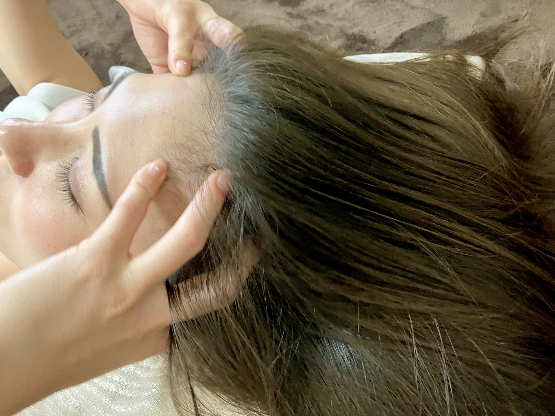 おでこまわりのタッチは、とてもソフトです。強く押すよりも、「頭がそっと広がる感覚」を出す方が、前頭筋や頭皮はゆるみやすく、自律神経の切り替えもスムーズになります。