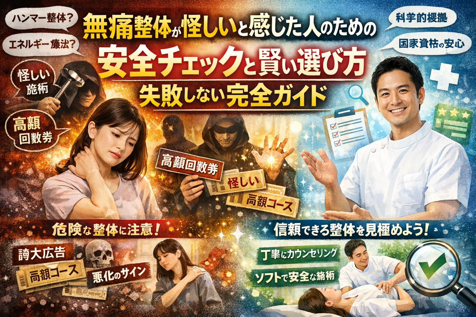 毎日の肩こりや頭痛、自律神経の不調をなんとかしたくて検索しているうちに「無痛整体が怪しい」「一野式筋肉骨調整法 怪しい」「ハンマー整体 怪しい」などの言葉が目に入り、不安が一気に膨らんでいないでしょうか。結論として、本当に危ないのは「痛くないこと」自体ではなく、科学的根拠が曖昧な理論と誇大な効果説明、高額回数券やエネルギー療法を絡めた商法、そして危険な施術で医療を遅らせてしまうケースです。