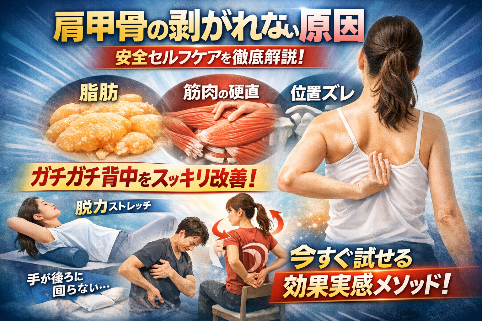 本記事では、「肩甲骨の剥がれない人」専用に、指が入らない原因を脂肪・筋肉・位置ズレの3方向から切り分け、危険なセルフ肩甲骨はがしと安全なストレッチの境界線を明確にします。さらに、仰向けでの脱力呼吸、椅子に座ったままできる肩甲骨回し、腕が後ろに回らない人向けモビライゼーションまで、レベル別に整理。猫背は10秒で治せる系のテクニックに飛びつく前に、ニュートラルポジションと睡眠姿勢を含めた「一生モノの肩甲骨うごかし」を手に入れたい方は、この先の章を順番に読み進めてください。